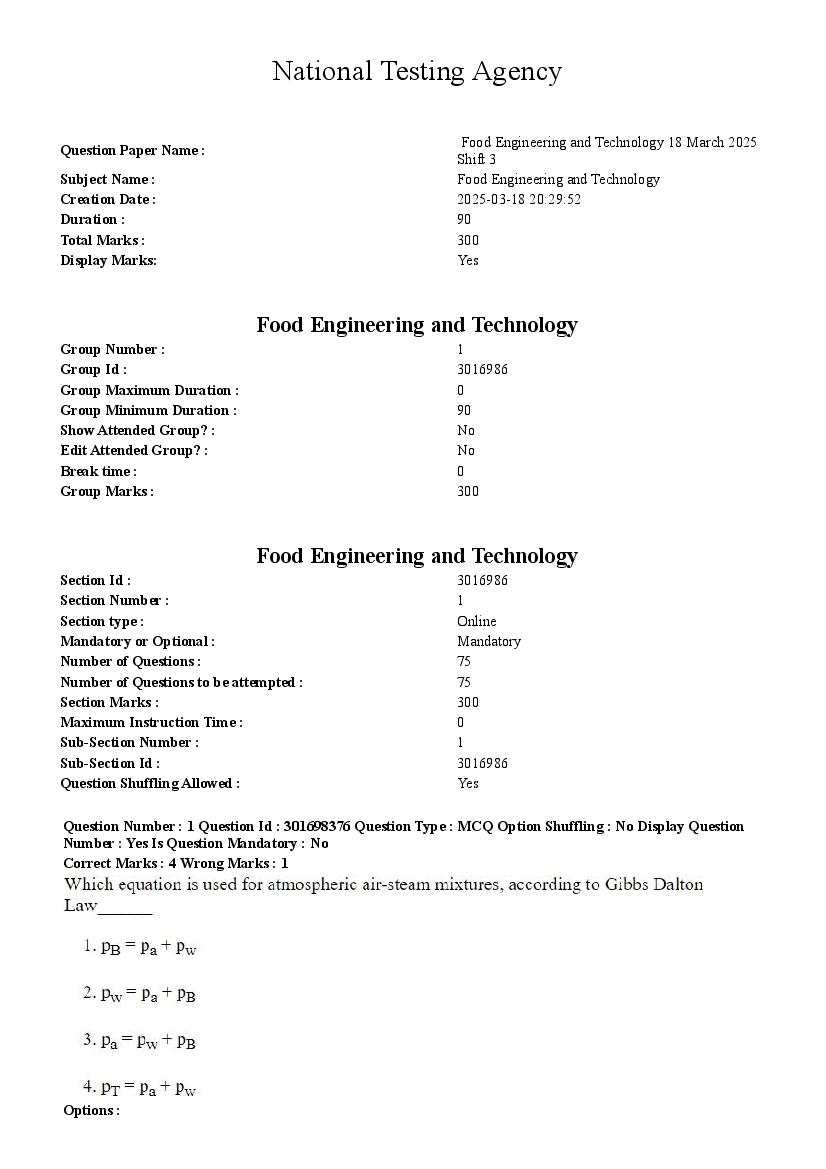 CUET PG Food Engineering and Technology Question Paper 2026 has been released. You can now download the CUET PG Food Engineering and Technology Previous Year Question Paper PDF here from aglasem. This CUET PG 2025 question paper is for the subject paper Food Engineering and Technology and contains the exact questions asked in the test. You can use it to practice for upcoming NTA Common University Entrance Test for Post Graduate for the Food Engineering and Technology test.