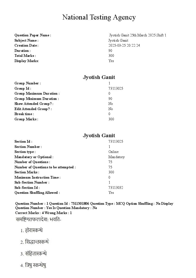 CUET PG 2025 Question Paper Jyotish Ganit View Download