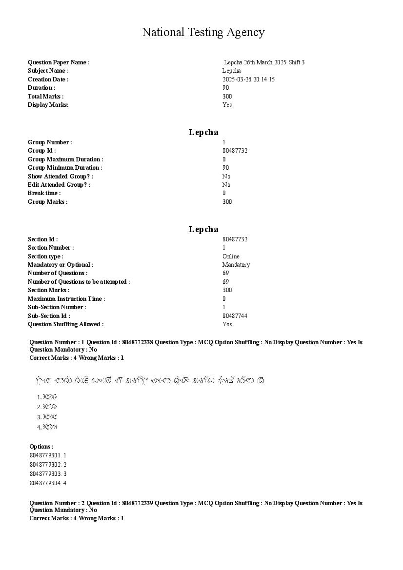 2026 Question papers will be updated soon. The latest available complete cuet pg question paper for Lepcha is given below.