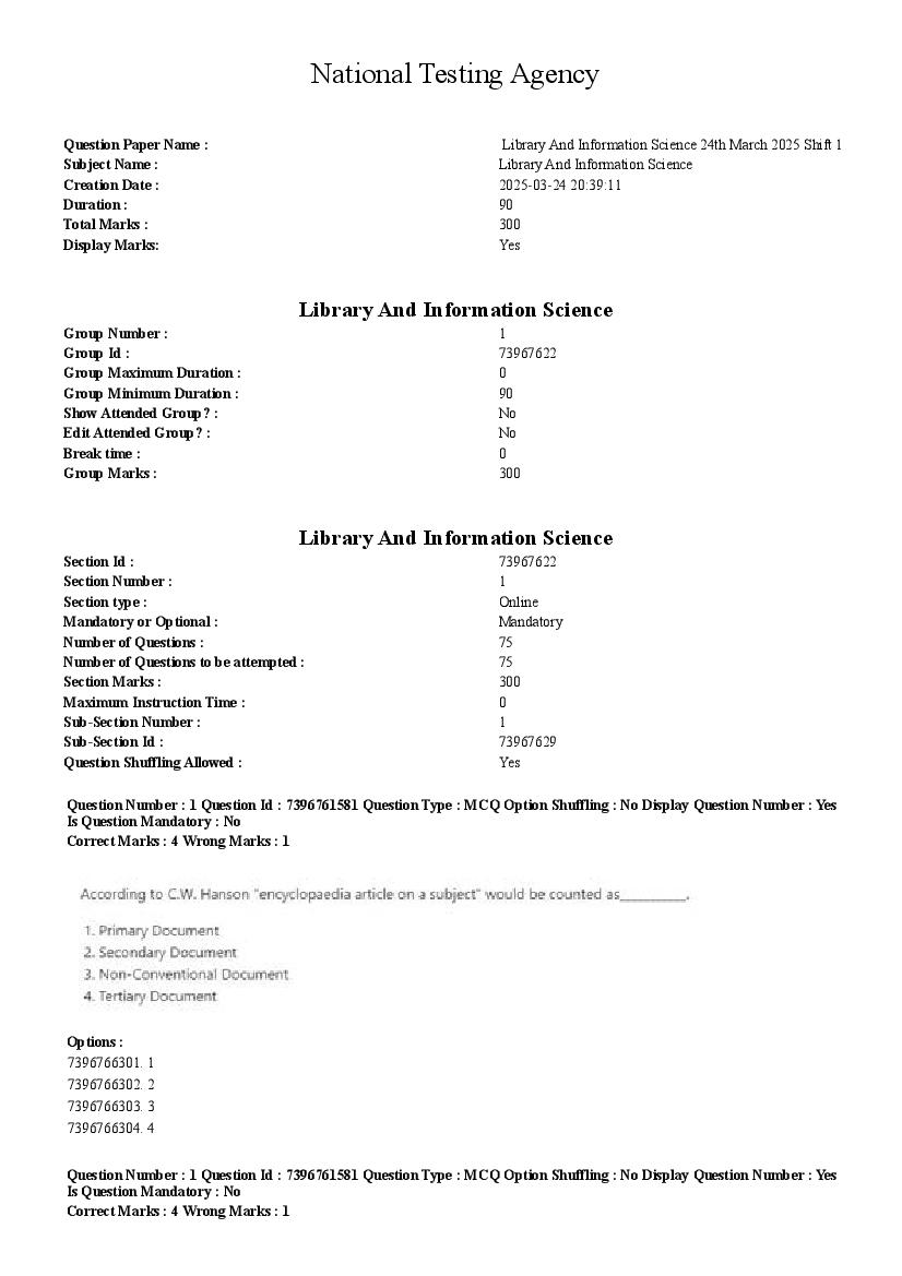 CUET PG Question Paper 2024 PDF for Library and Information Science Download Link – Click Here to Download Question Paper PDF
