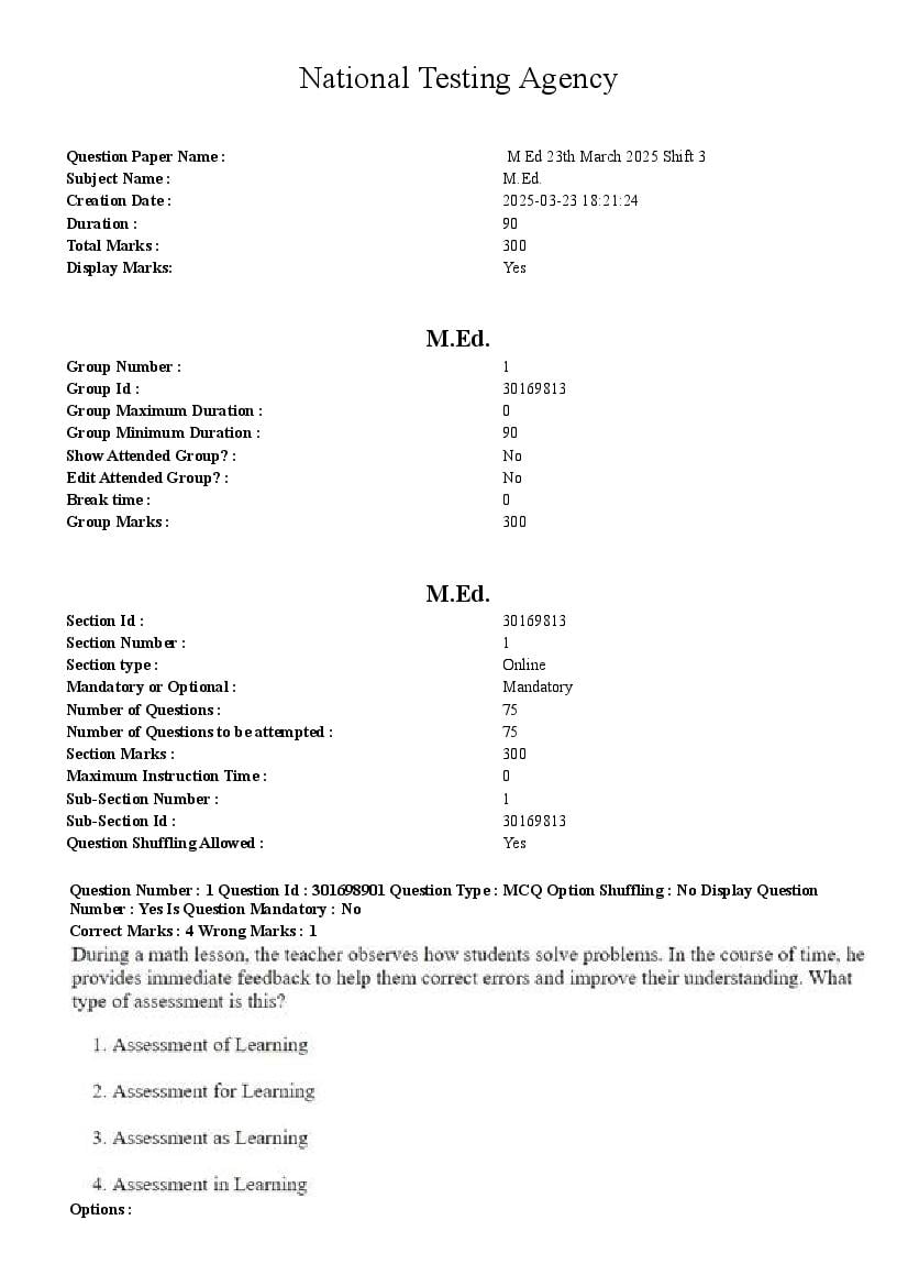 CUET PG 2025 Question Paper M.Ed. View Download