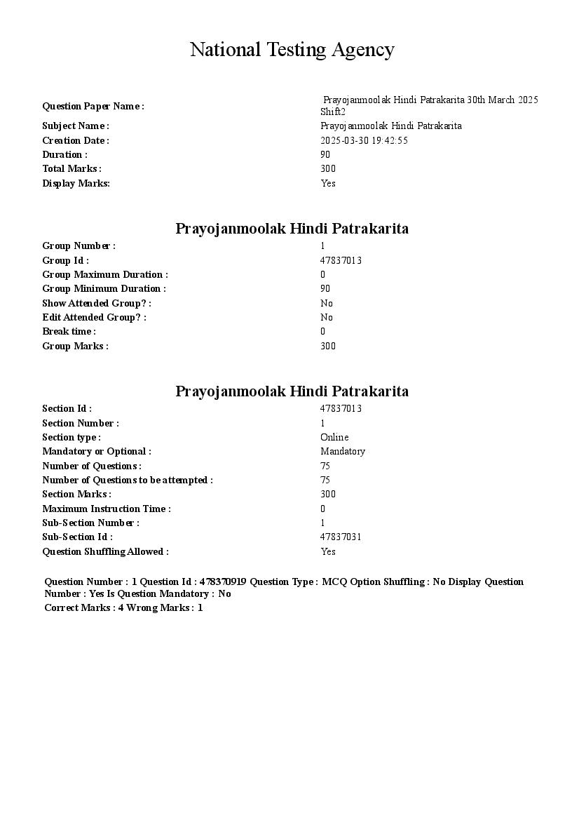 CUET PG 2025 Question Paper Prayojanmoolak Hindi Patrakarita View Download