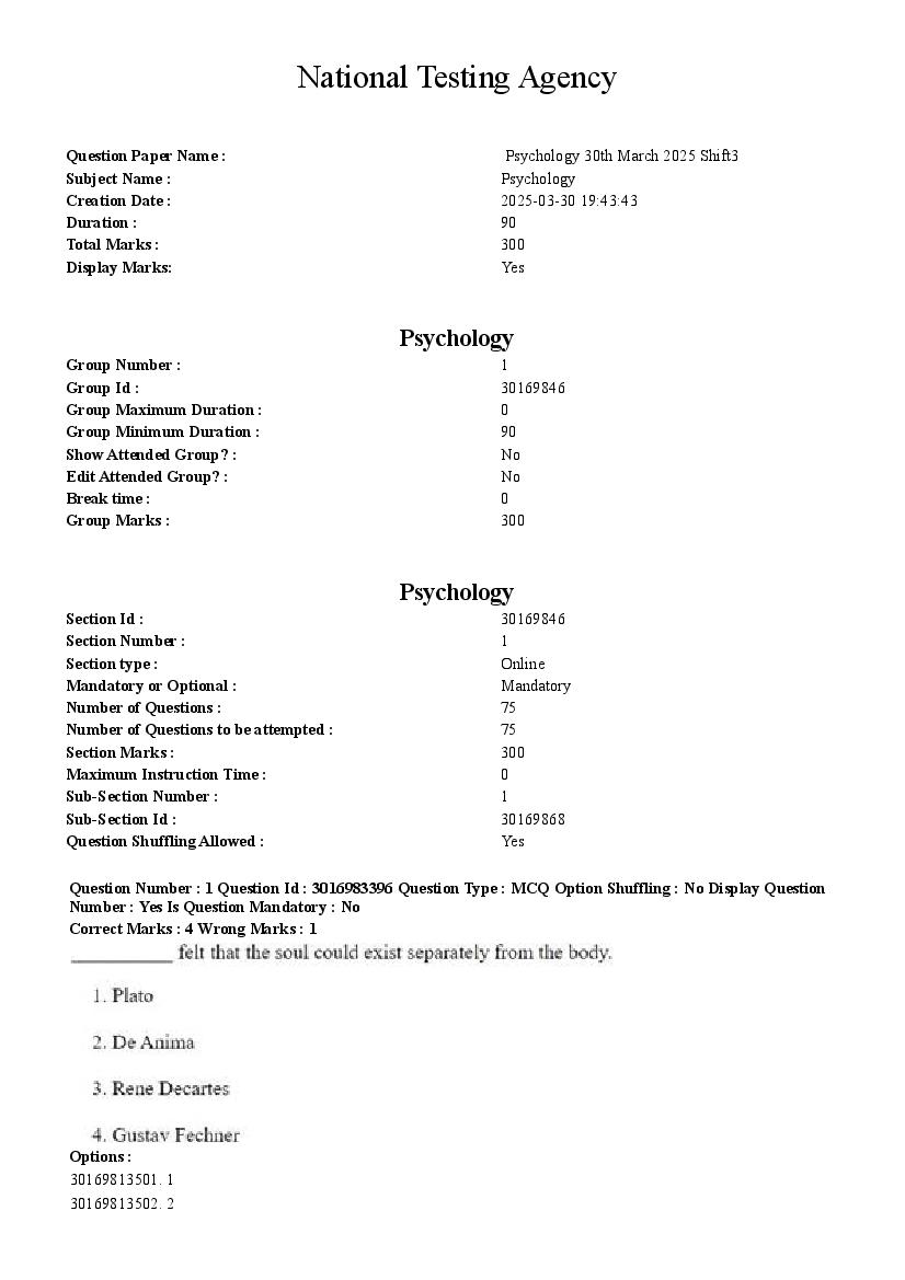 CUET PG 2025 Question Paper Psychology View Download