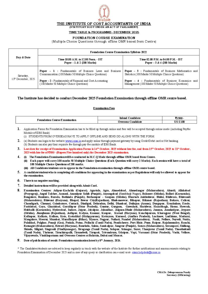 Institute of Cost Accountants of India has released the schedule and programme notification for the Foundation Examination of the December 2025 term. Candidates can check the notification below the image.