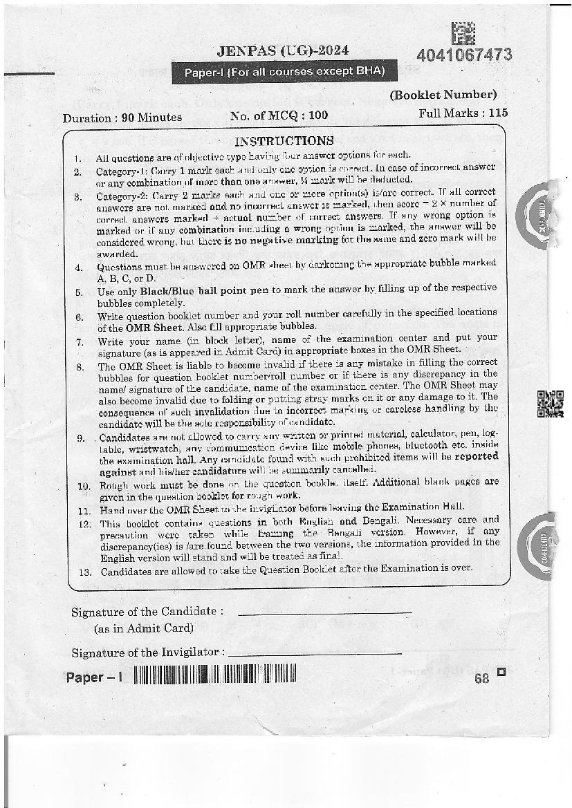 The key highlights of this Joint Entrance Test for Nursing, Paramedical and Allied Sciences Under Graduate Courses (WBJEE JENPAS UG) 2024 question papers are as follows.