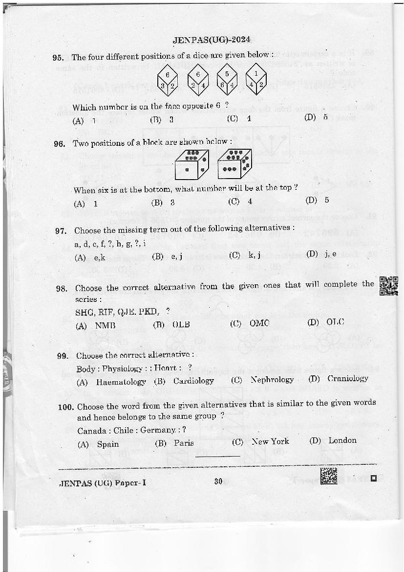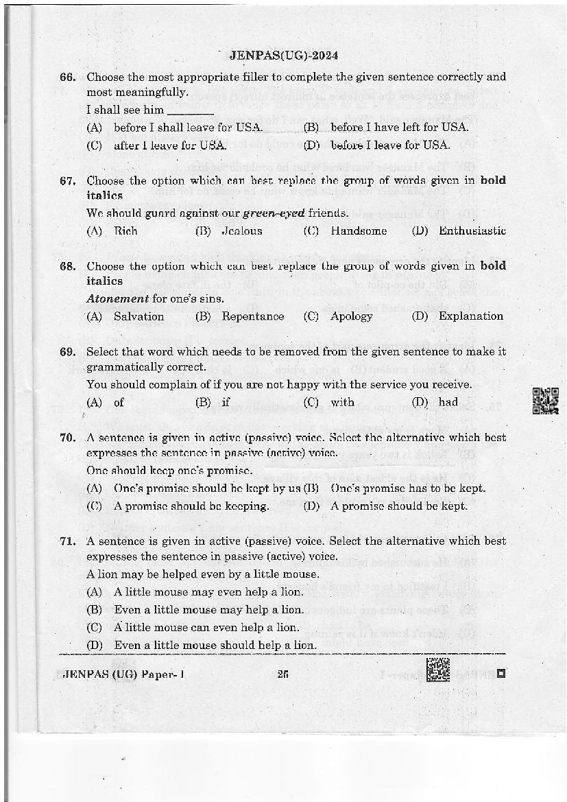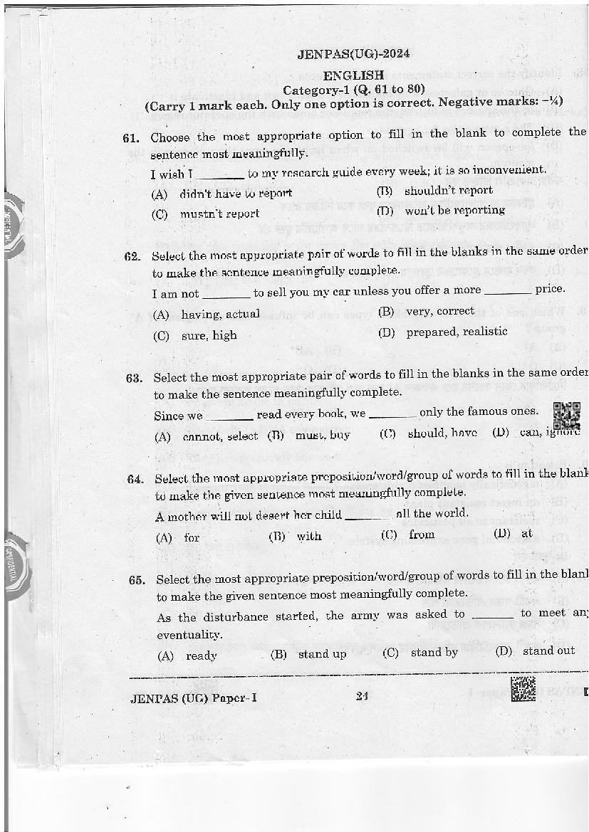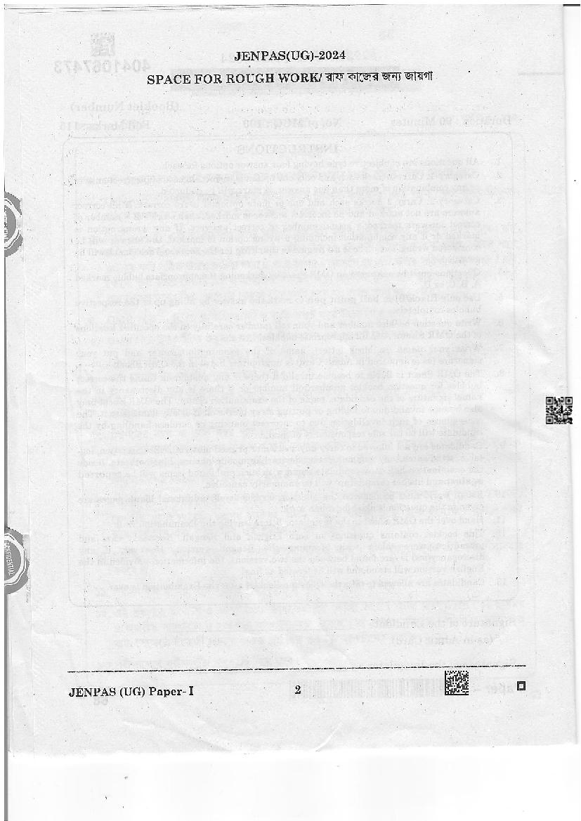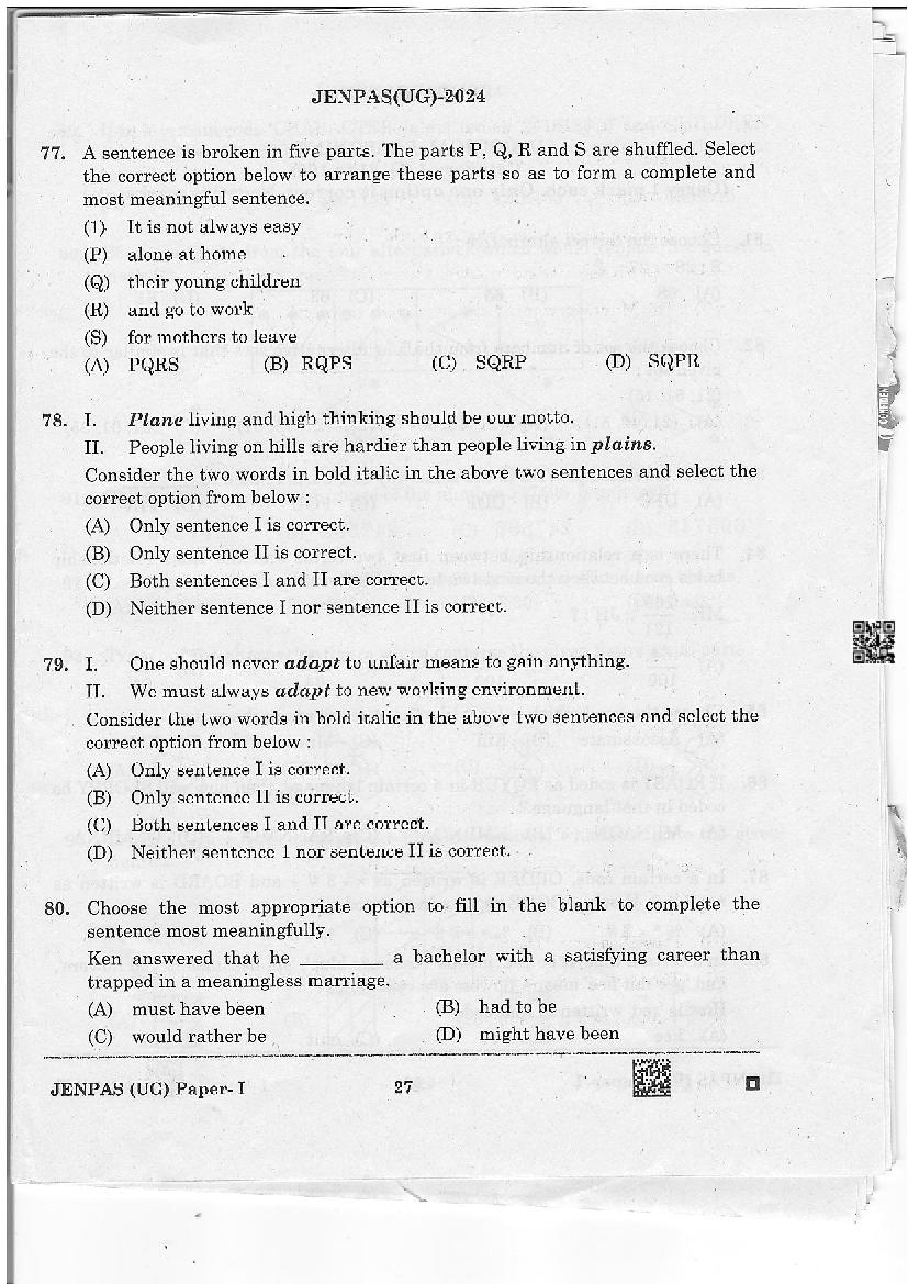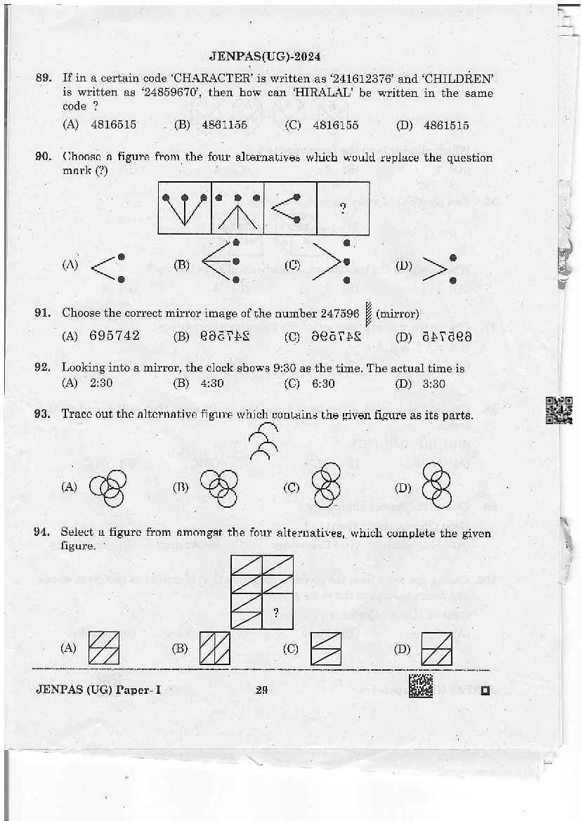 The question paper of JENPAS UG 2024 is as follows. Joint Entrance Test for Nursing, Paramedical and Allied Sciences Under Graduate Courses (WBJEE JENPAS UG) is the State level Nursing entrance exam for admission to B.Sc Nursing, BPT, BMLT, BSc CCT, BSc OTT, BSc PT, BSc PA, BSc MMB, BVSO, BHA in Colleges in West Bengal.