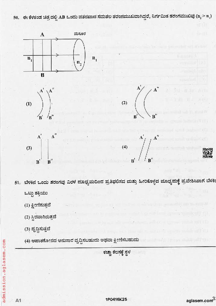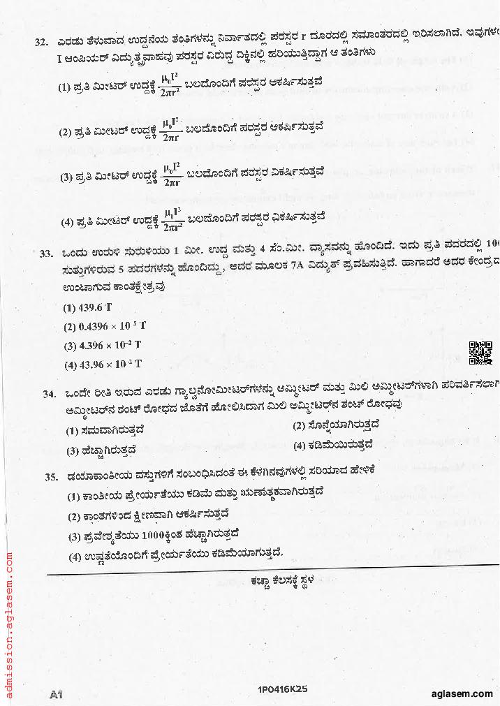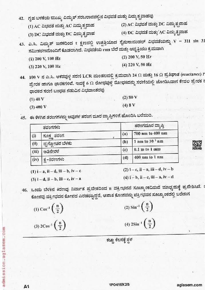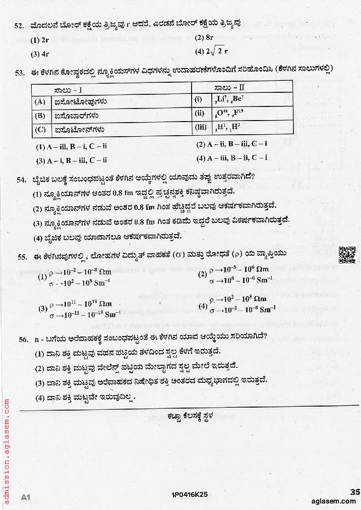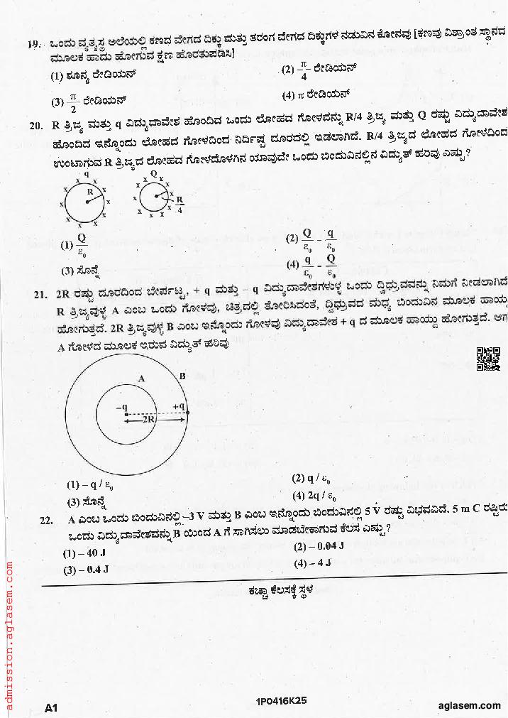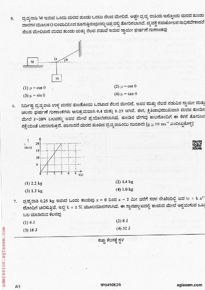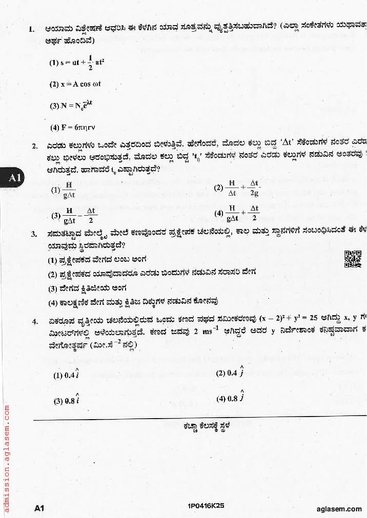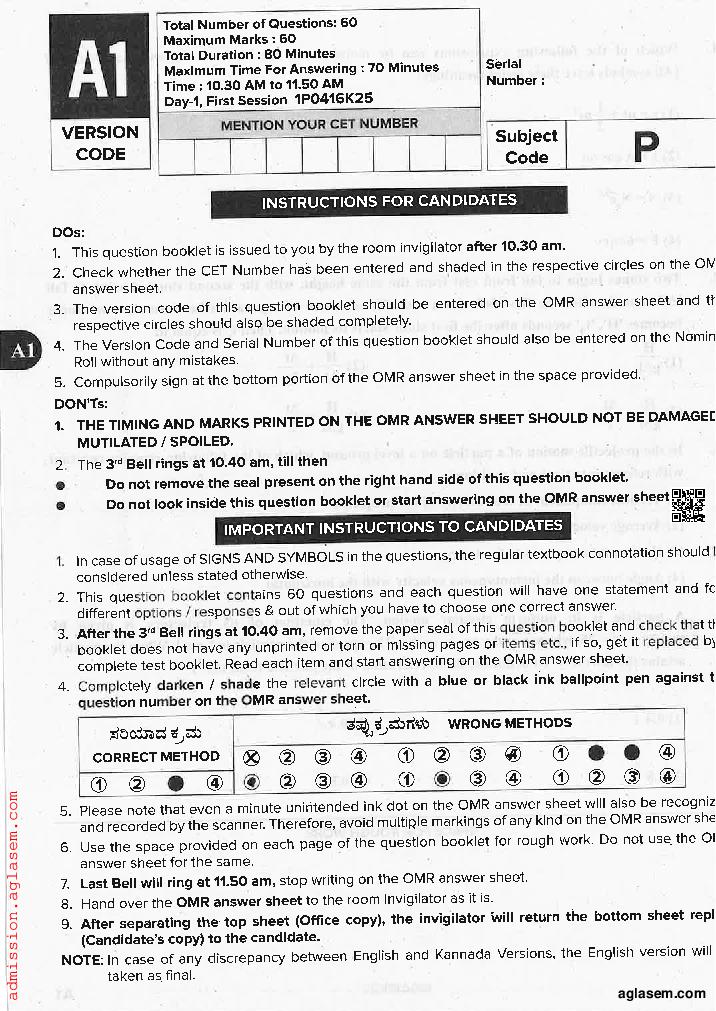 The question paper of KCET 2025 is as follows. Karnataka Common Entrance Test (KCET) is the State level Common entrance exam for admission to Engineering, Technology, Architecture, Bachelor of Yoga and Naturopathy (BNYS), Bachelor of Veterinary Science and Animal Husbandry (B.V.Sc. & A.H.), Farm Science courses i.e., [i.e., Bachelor of Veterinary Science and Animal Husbandry (B.V.Sc. & A.H.), B.Sc. (Hons) Agriculture, B.Sc. (Hons) Sericulture, B.Sc. (Hons) Horticulture, B.Sc (Hons) Forestry, B.Tech (Bio-Technology), B.Sc.(Hons) Community Science, B.Tech (Agricultural Engineering), B.Tech (Food Technology), B.Tech (D. Tech), B.F.Sc (Fisheries), B.Sc. (Hons) Agri. Business Management] B. Pharma, Pharma-D and 2nd year B-Pharma (Lateral Entry) course in Government, University, Private Aided, Private Un-Aided Professional Educational Institutions.