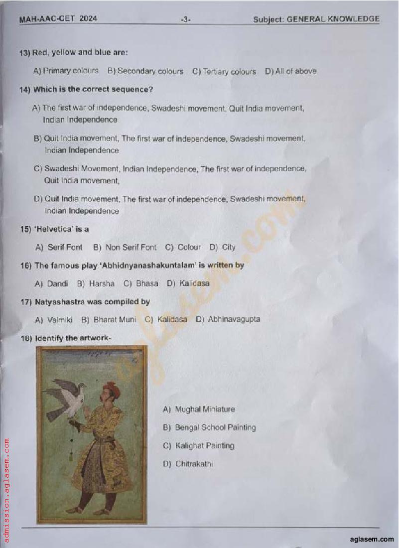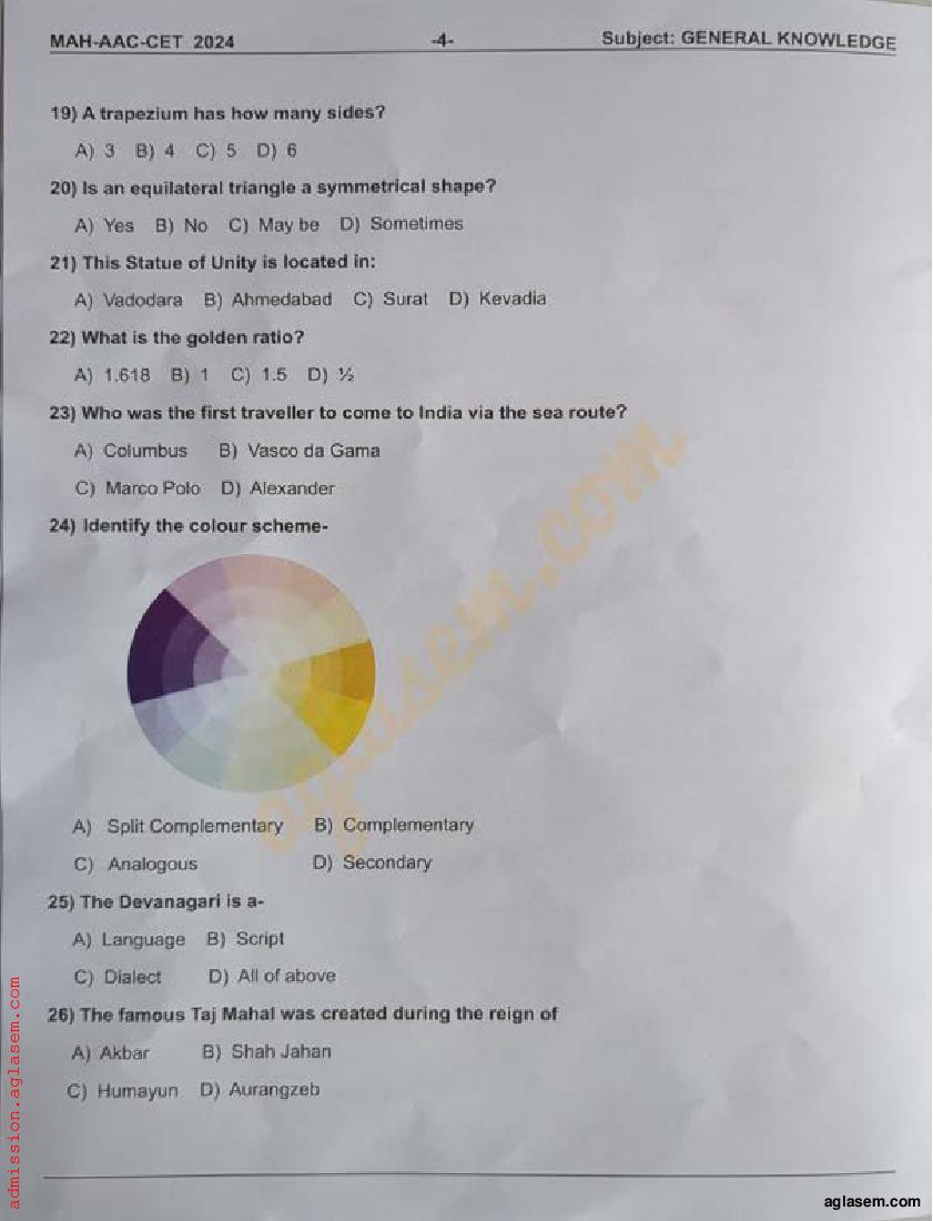 The question paper of MAH AAC CET 2024 is as follows. Maharashtra Applied Arts and Crafts Common Entrance Test (MAH AAC CET) is the State level Art / Design entrance exam for admission to BFA in Art, Fashion and Design Colleges of Maharashtra Participating in CAP.