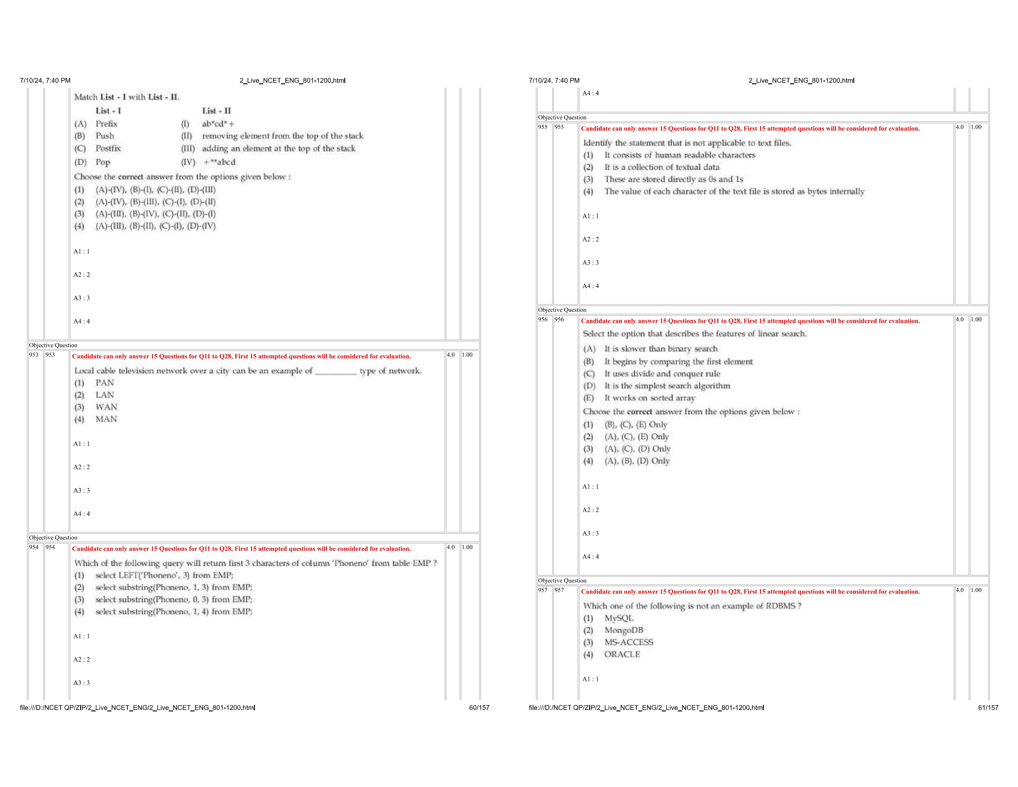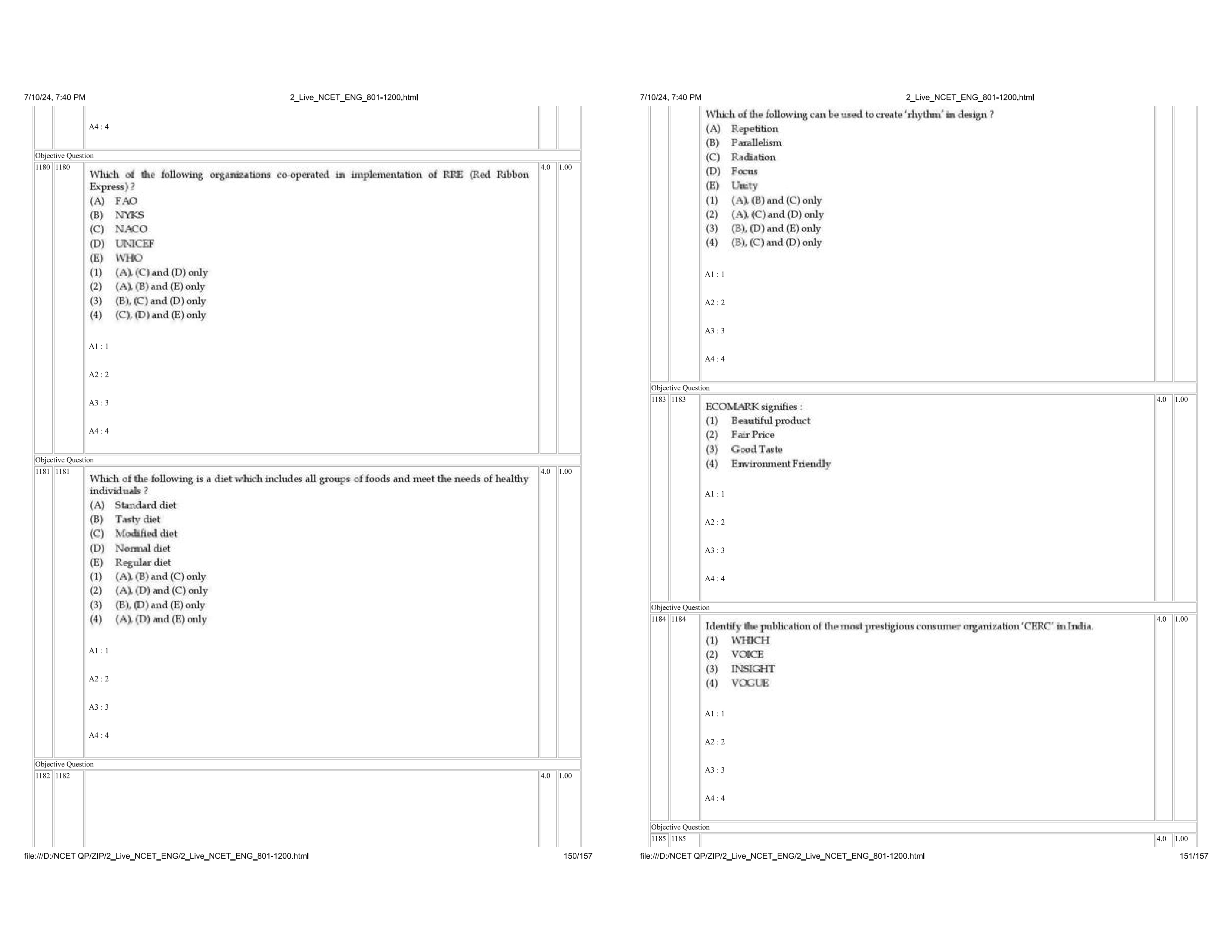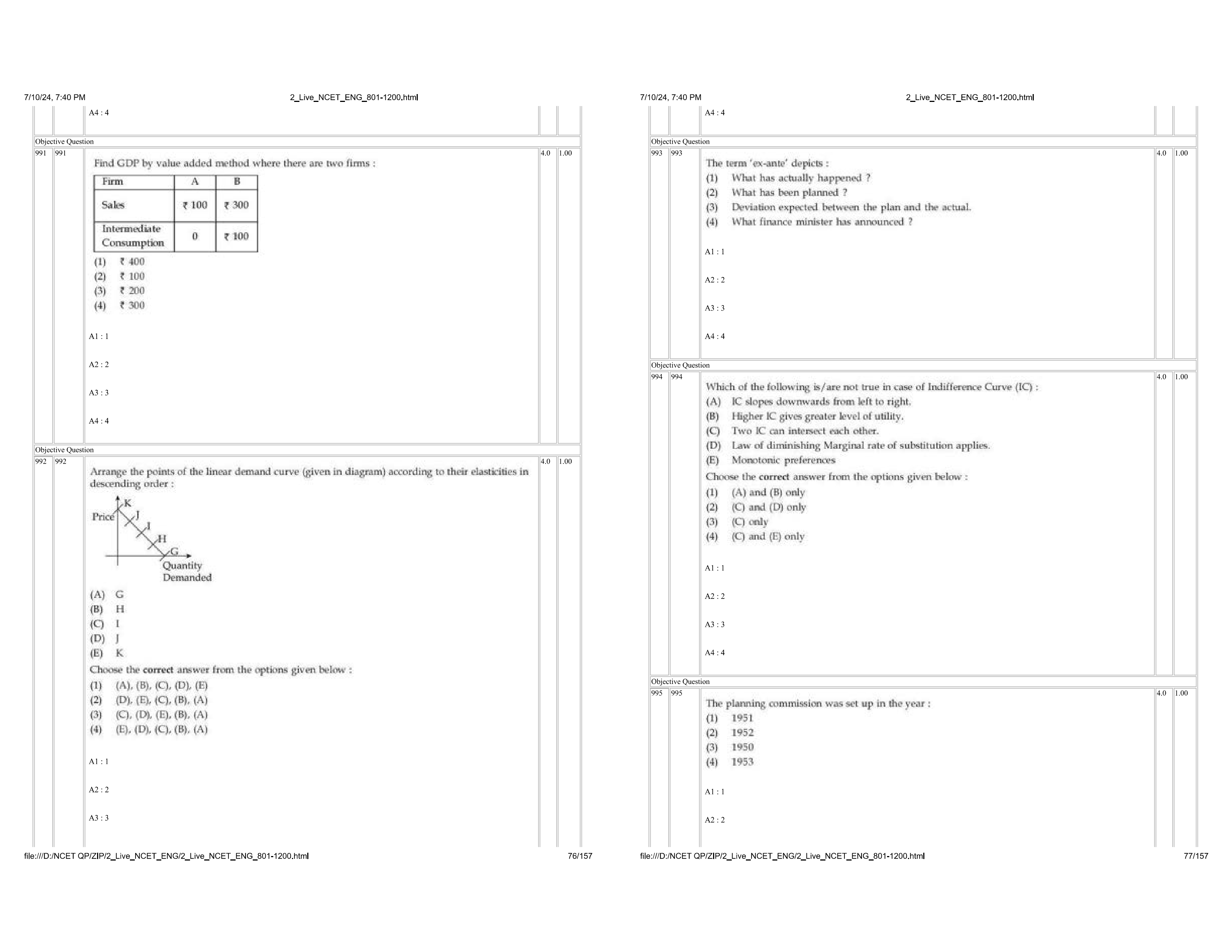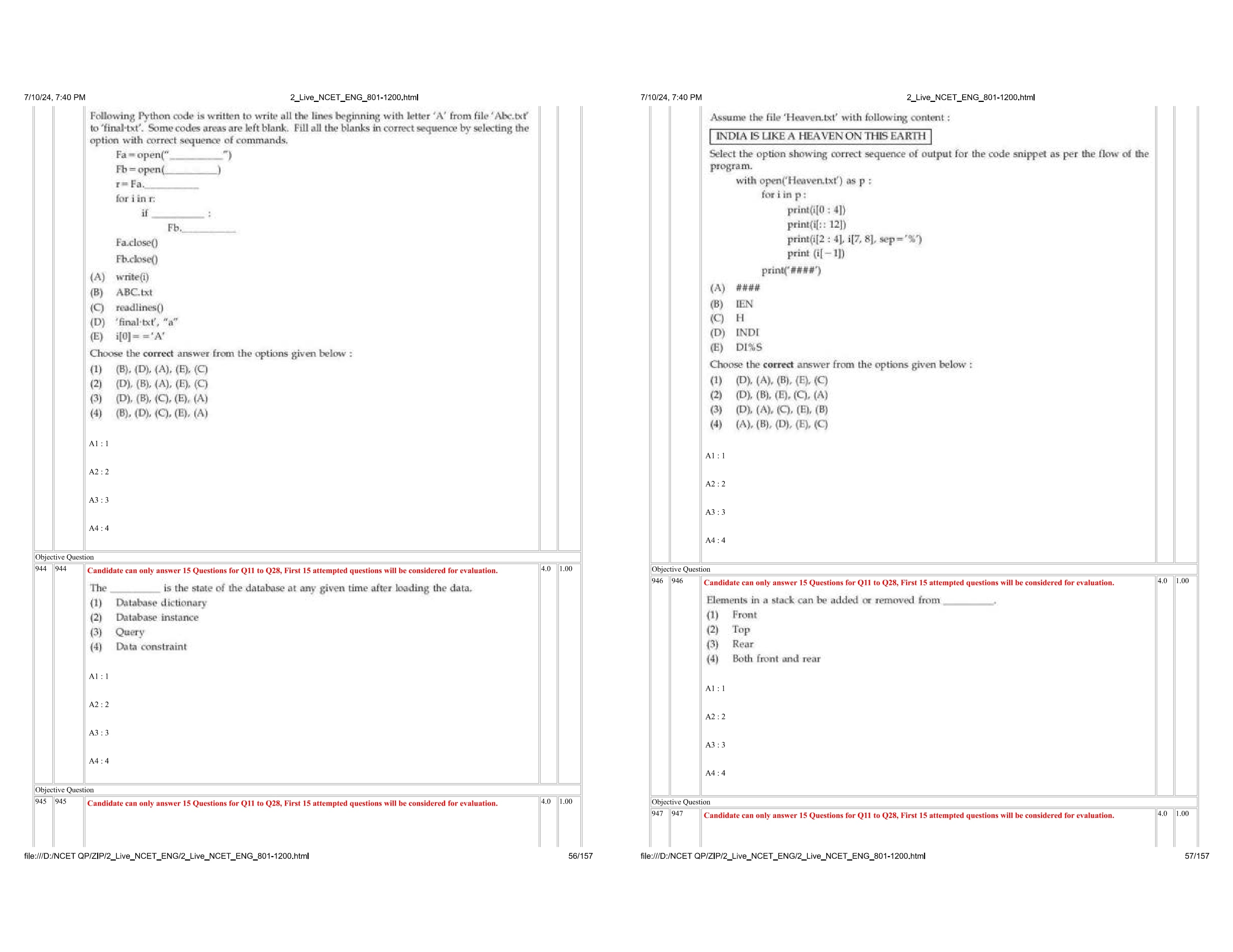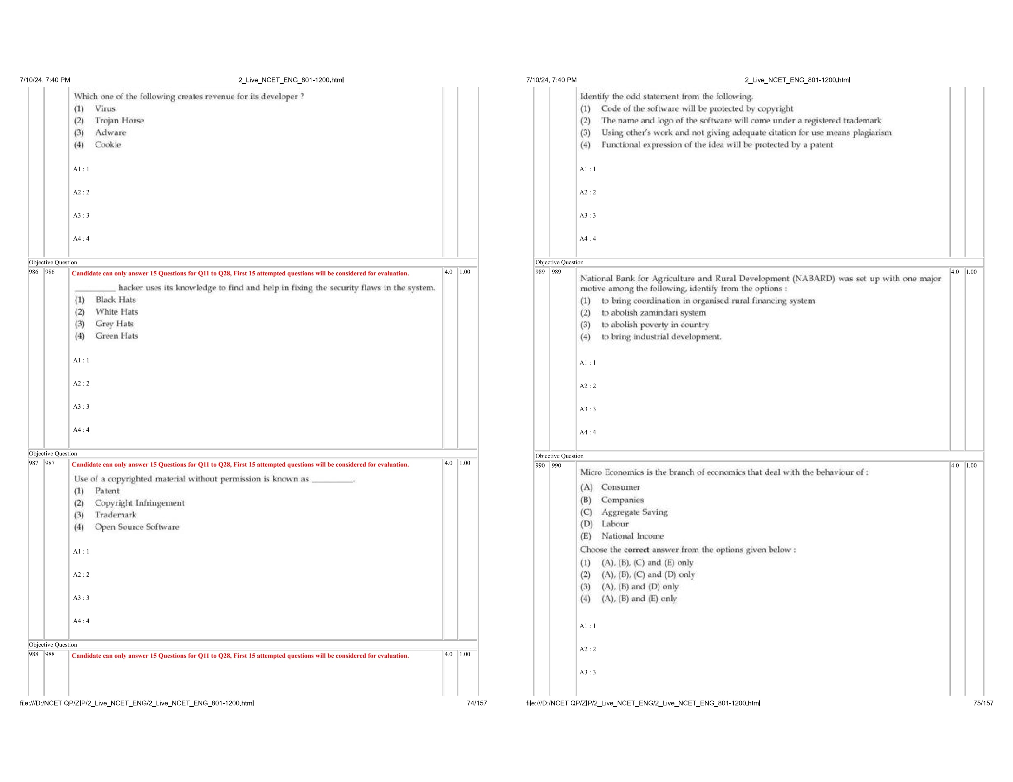 The question paper of NCET 2024 is as follows. National Common Entrance Test (NCET) is the National level Education entrance exam for admission to 4-Year Integrated Teacher Education Programme (ITEP) in Central, State Universities, Institutions including IITs, NITs, RIEs, and Government Colleges.